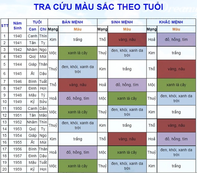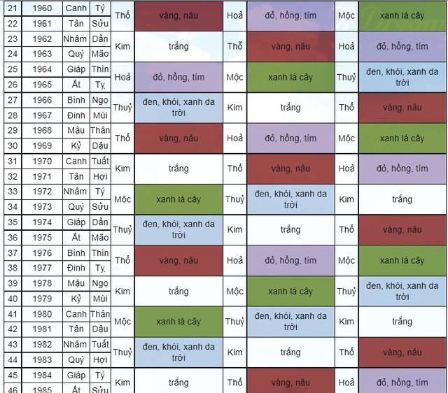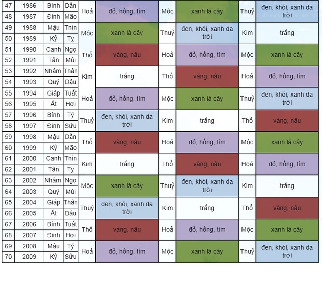 Quý vị có thể sử dụng bảng tra cứu màu sắc theo phong thủy sau đây để lựa chọn cho ngôi nhà mình những màu sơn, màu các đồ dùng như cầu thang, màu vật liệu vách cabin và cửa thang máy đồ gia dụng hợp với tuổi và mệnh của mình nhất.